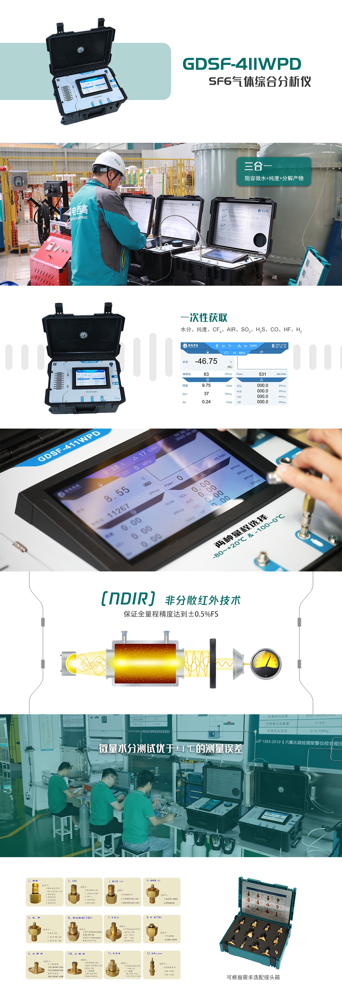 GDSF-411WPD帶泵回 SF6氣體綜合分析儀是集SF6濕度、SF6純度測試以及SF6氣體分解物測試于一體,將原來要用三臺(tái)儀器才能實(shí)現(xiàn)的功能,集中在一臺(tái)儀器。一次現(xiàn)場測量,即可完成所有指標(biāo)檢測,大大節(jié)省了設(shè)備中的氣體,同時(shí)減少用戶的工作量,提高了工作效率。