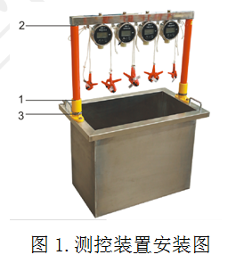 絕緣手套泄漏電流測控裝置具有多路復(fù)用結(jié)構(gòu),能實(shí)現(xiàn)4路絕緣手套或絕緣靴的試驗(yàn)。裝置平臺(tái)由接地托盤、水槽、海綿地電極、不銹鋼托架、絕緣支撐桿和高壓無線微安表組成,安裝方法如圖1;