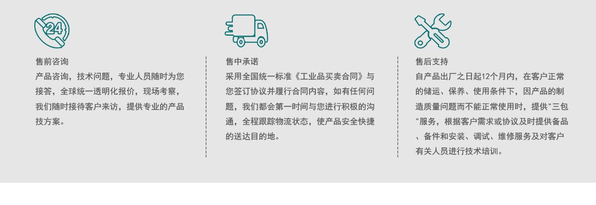 自產(chǎn)品出廠之日起12個月內(nèi),在客戶正常 的儲運、保養(yǎng)、使用條件下,因產(chǎn)品的制 造質(zhì)量問題而不能正常使用時,提供"三包 "服務(wù),根據(jù)客戶需求或協(xié)議及時提供備品 、備件和安裝、調(diào)試、維修服務(wù)及對客戶 有關(guān)人員進(jìn)行技術(shù)培訓(xùn)。
