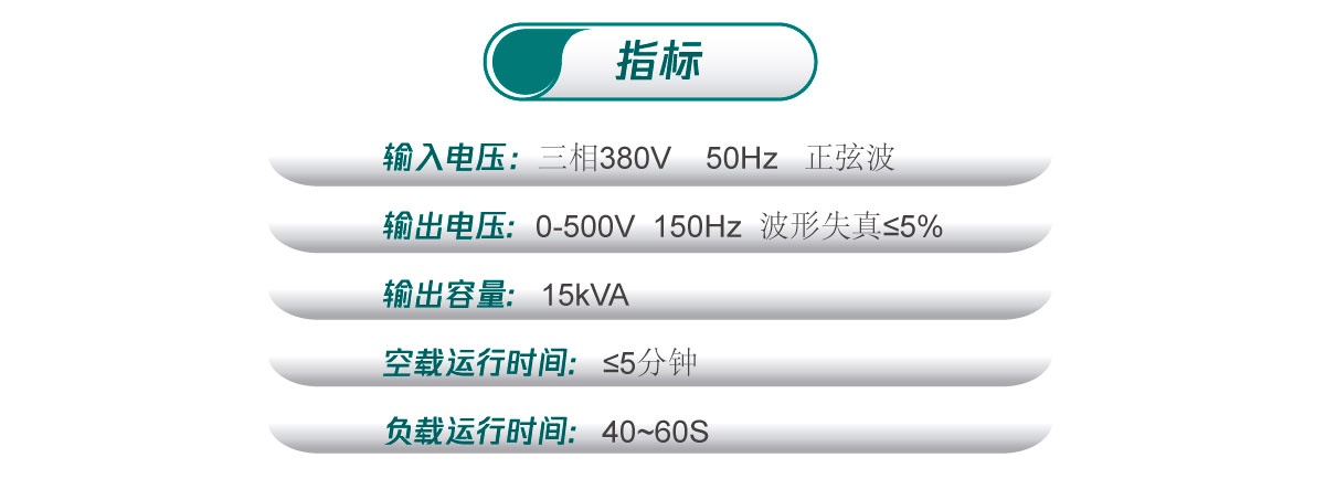• 本產品可作為變壓器及相應容量電器作感應耐壓試驗或作短時運行的150Hz電源用。