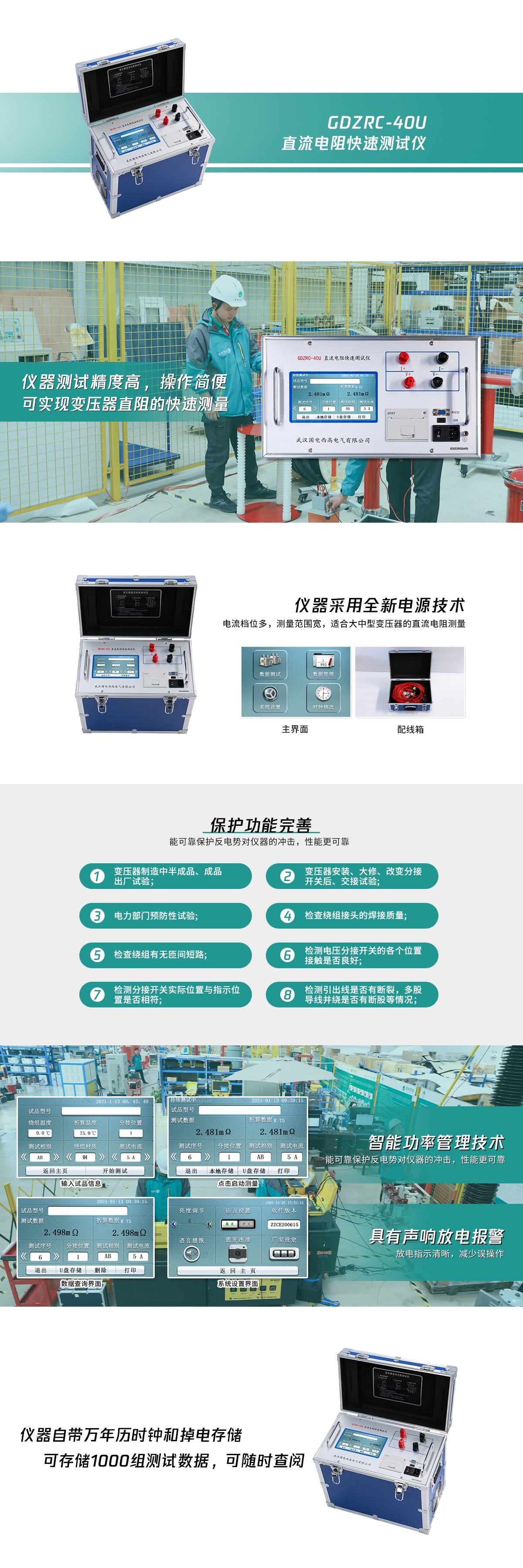 變壓器直流電阻是變壓器制造中半成品、成品出廠試驗(yàn)、安裝、大修、改變分接開關(guān)后、交接試驗(yàn)及電力部門預(yù)防性試驗(yàn)的必測(cè)項(xiàng)目。可以檢查繞組接頭的焊接質(zhì)量和繞組有無匝間短路,可以檢測(cè)電壓分接開關(guān)的各個(gè)位置接觸是否良好以及分接開關(guān)實(shí)際位置與指示位置是否相符,引出線是否有斷裂,多股導(dǎo)線并繞是否有斷股等情況。為了滿足變壓器直流電阻快速測(cè)量的需要,我公司研制的GDZRC-40U直流電阻測(cè)試儀。該儀器采用全新電源技術(shù),具有體積小、重量輕、輸出電流大、重復(fù)性好、抗干擾能力強(qiáng)、保護(hù)功能完善等特點(diǎn)。整機(jī)由高速單片機(jī)控制,自動(dòng)化程度高,具有自動(dòng)放電和放電報(bào)警功能。儀器測(cè)試精度高,操作簡便,可實(shí)現(xiàn)變壓器直阻的快速測(cè)量。