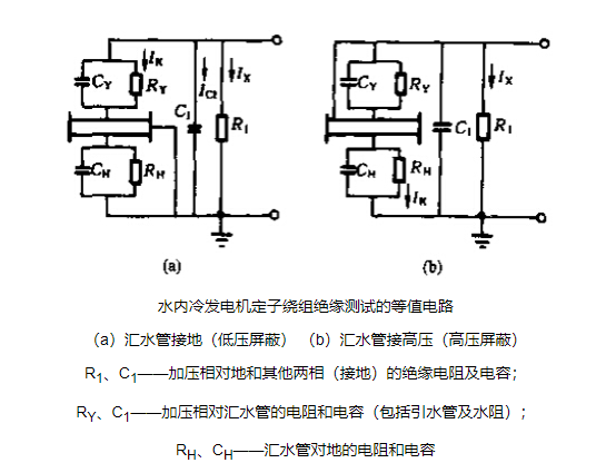 在通水或不通水時,為了測得真正的水內冷定子繞組絕緣電阻R1(即Ri),必須將匯水管接至兆歐表的屏蔽端子上(如下圖將Ry或RH屏蔽)。