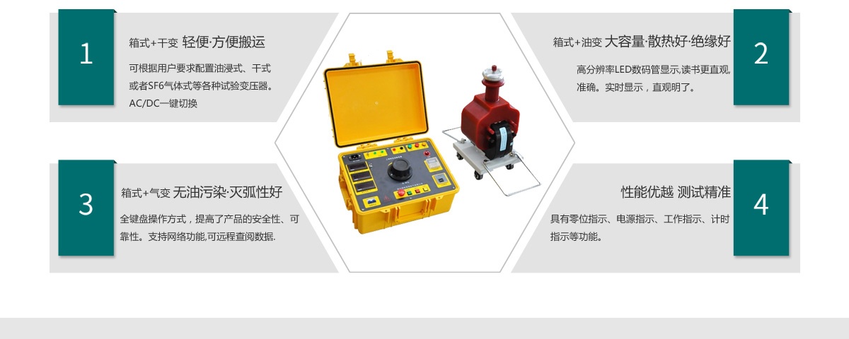 可根據(jù)用戶要求配置油浸式、干式或者SF6氣體式等各種試驗(yàn)變壓器。