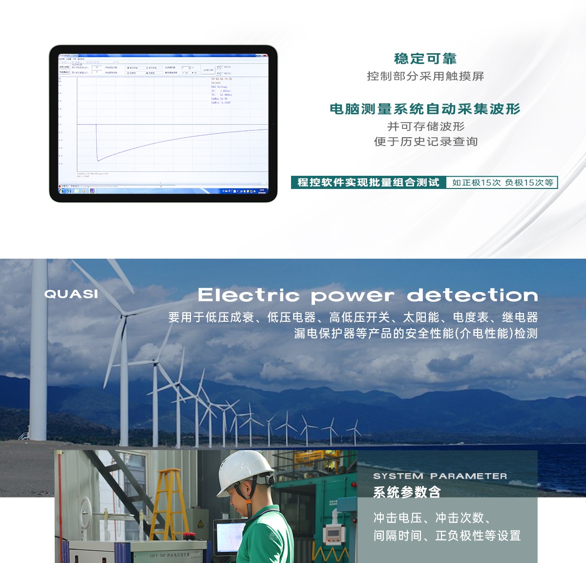 GDCY-30P型程控自動沖擊電壓試驗儀主要是根據TB/T 2653、GB/T17627、GB/T16927等標準要求,主要用于低壓成套、低壓電器、高低壓開關、太陽能、電度表、繼電器、漏電保護器等產品的安全性能(介電性能)檢測。