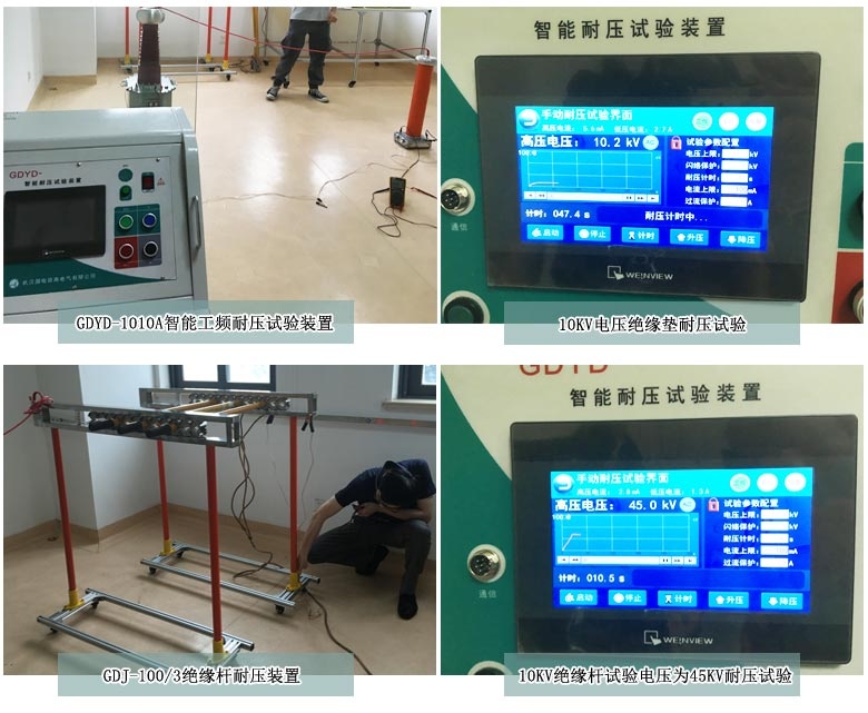 在客戶的組織下,試驗前我司技術工程師對本次調試設備進行設備組裝流程、接地線的方法、變壓器的連接、電源線的布局、注意事項等知識為客戶詳細培訓。客戶充分掌握了該設備相關知識后,開始動手操作GDYD-1010A智能工頻耐壓試驗裝置,智能工頻耐壓試驗裝置通過高壓線連接至100kV分壓器,儀器空升到100kV,誤差在1.5%以內,儀器正常。接著用這套設備對4.2*2m的絕緣墊做電壓為10kV的一分鐘耐壓試驗,測試合格。