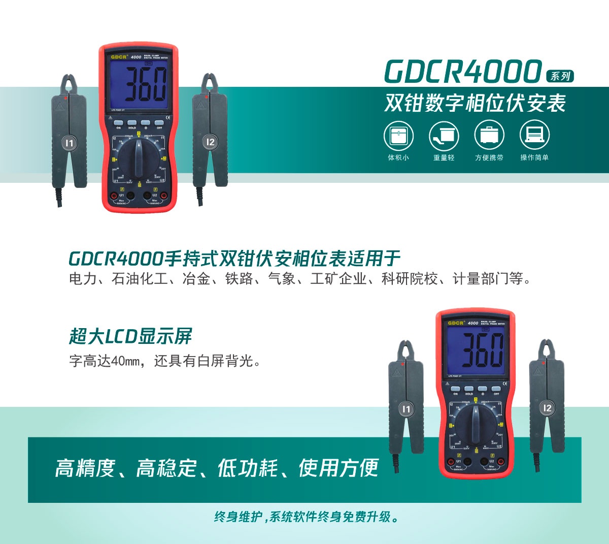 GDCR4000手持式雙鉗伏安相位表可以在被測回路不開路的情況下直接測量交流電壓和交流電流,測量兩電壓間、兩電流間和電壓電流間的相位,此外,還可間接測得電路的功率因數和功率,可以判別三相相序,變壓器接線組別、感性、容性電路,測試二次回路和母差保護系統,讀出差動保護各組CT之間的相位關系,檢查電度表的接線正確與否,檢修線路設備等。