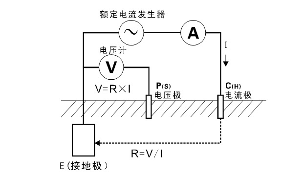 如圖所示:從被測物體起,分別將P(H)、C(H)輔助接地棒呈一條直線深埋入大地,將接地測試線(黑、綠、黃、紅)從儀表的E、ES、P(S)、C(H)接口對應(yīng)連接到被測接地極E、輔助電壓極P(S)、輔助電流極C(H)上。